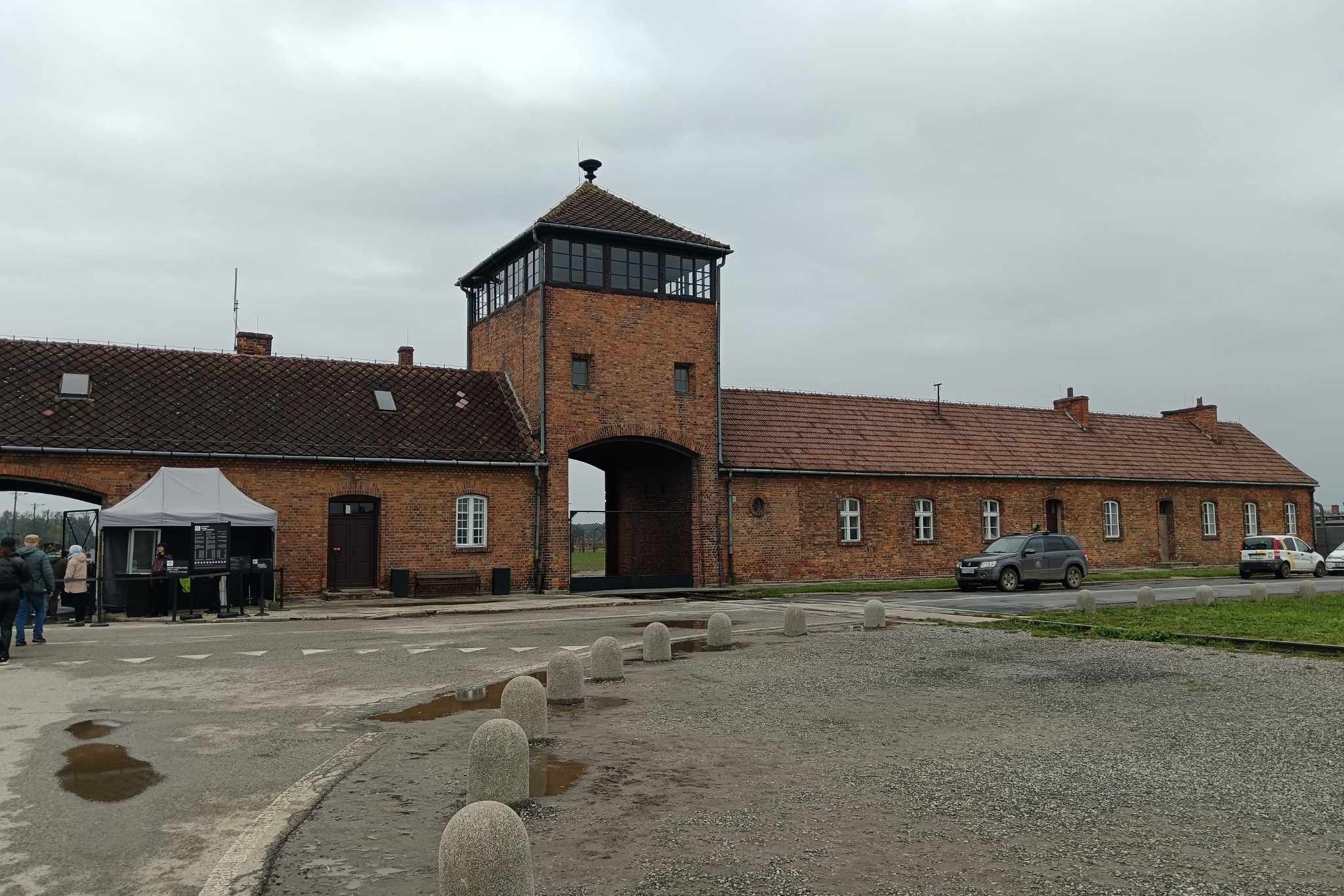 Auschwitz–Birkenau bejárata, középen a kapuval, melyen egykor a teli vagonok gurultak be. Mögötte a peron, ahol a rettegett válogatások zajlottak (Fotó: UNIside / Török Sára)