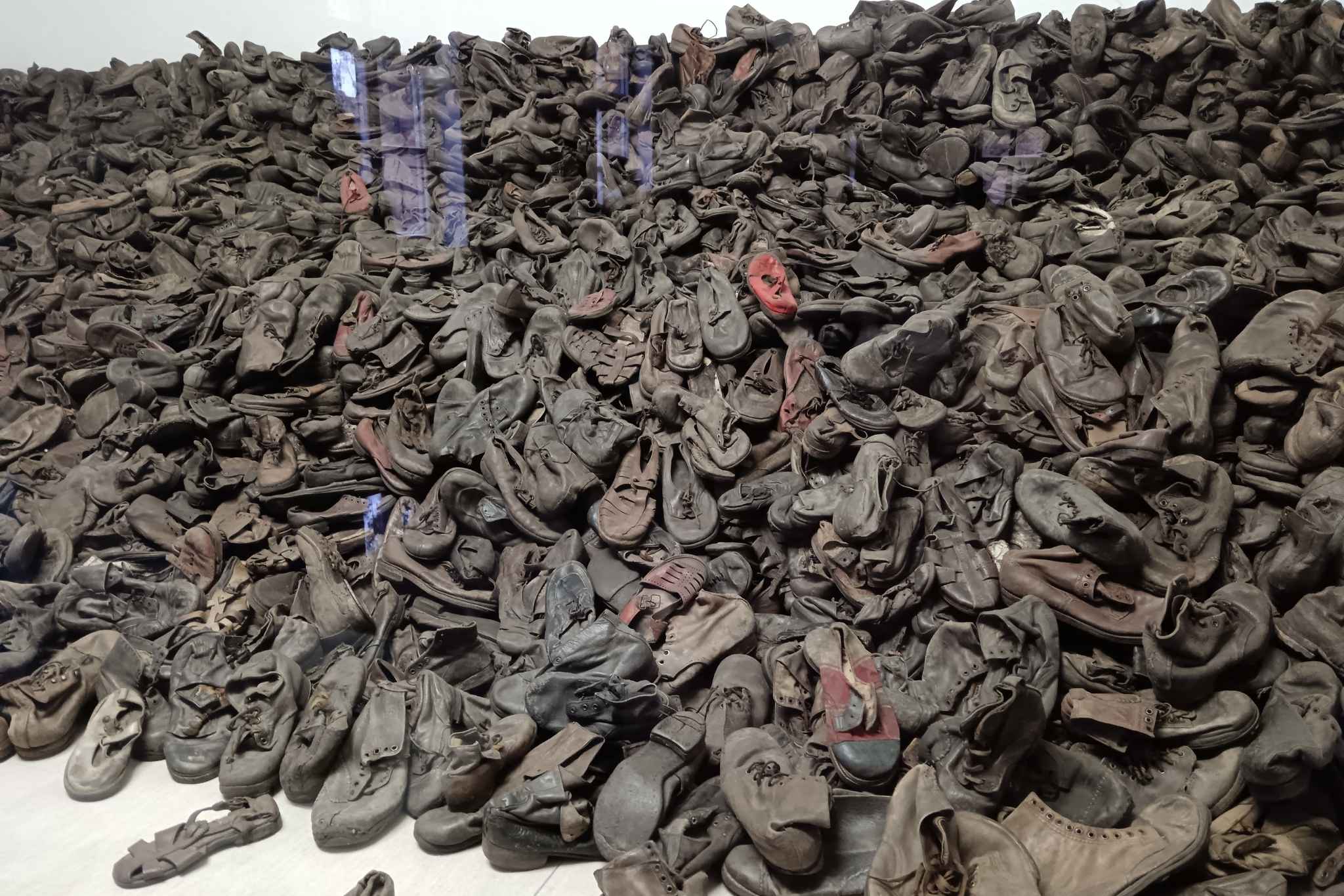 Az elhunyt foglyok cipői, melyeket a tábor emlékmúzeummá alakításakor egy helyre gyűjtöttek (Fotó: UNIside / Török Sára)