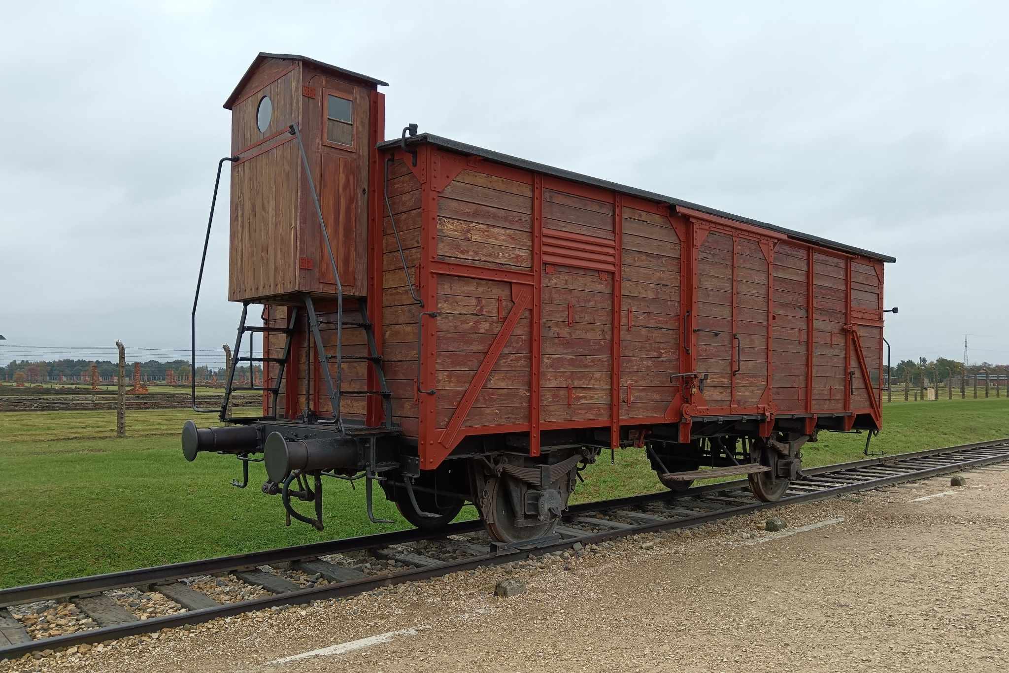 Kiállított vagon Auschwitz–Birkenauban, előtte a peron, a háttérben a barakokk romjai (Fotó: UNIside / Török Sára)