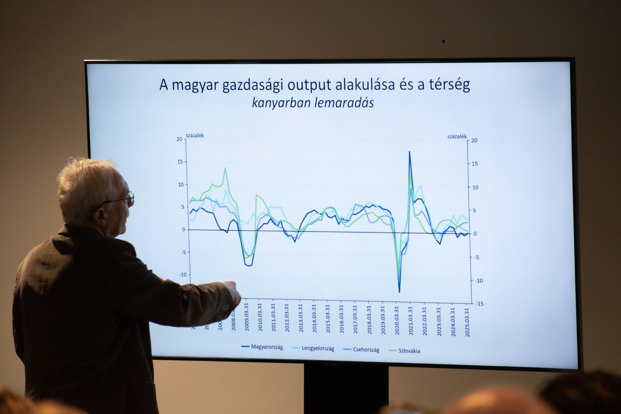 A délelőtt kulcseseménye Bod Péter Ákos közgazdász előadása volt. A volt jegybankelnök egy hasonlattal írta le Magyarország helyzetét a régiós versenyben: a gazdaságot egy járműhöz hasonlította. Mint mondta, ha egy teherautót túlságosan megpakolnak, és jön egy éles kanyar vagy emelkedő, az óhatatlanul lassabban veszi az akadályt, mint egy alacsonyabb súlypontú, sportosabb jármű. Magyarország esetén a fölösleges terhet például a magas államadósság és a szerkezeti problémák jelentik. Ezekre az ismert közgazdász ábrák segítségével rá is mutatott, kiemelve, hogy mely területekre költ az ország sokkal többet és melyekre kevesebbet, mint az EU vagy a V4-ek átlagosan.