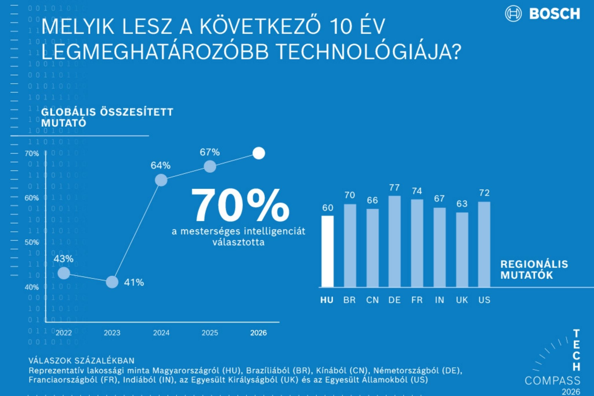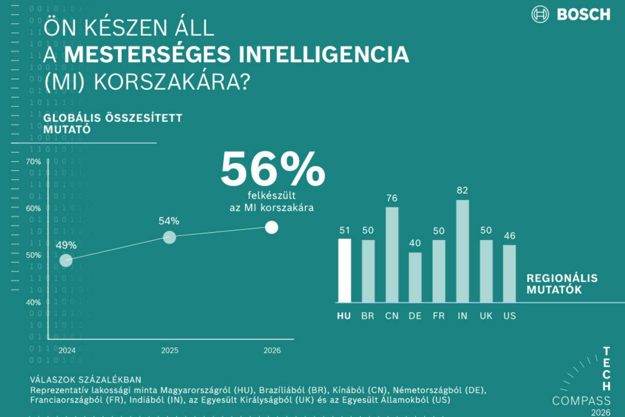 Ehhez kapcsolódóan készítette el a felmérését a Bosch Tech Compass, mégpedig a Gesellschaft für Innovative Marktforschung mbH (GIM) segítségével. 2025 őszén, hét országban, összesen több mint 12 ezer 18 év feletti embert kérdeztek meg az MI különböző aspektusairól. Az Egyesült Királyságban, Franciaországban, Magyarországon és Németországban országonként ezren, míg az Amerikai Egyesült Államokban, Brazíliában, Indiában és Kínában kétezren vettek részt a kutatásban. A reprezentatív felmérést a magyarországi Bosch csoport megbízásából itthon immár második alkalommal végezték el, a Bosch-t azonban a kérdezés során egyszer sem nevezték meg megrendelőként.
