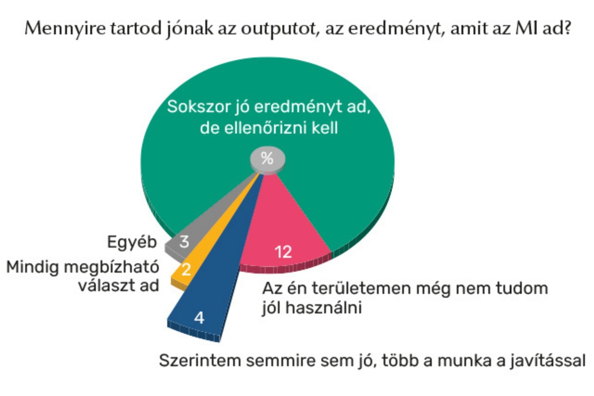 A válaszadó hallgatók 79 százaléka alapvetően elégedett az MI által adott válaszokkal, ugyanakkor szükségesnek tartja azok ellenőrzését. Ötödük szerint a technológia jelentősen, 35 százalék szerint inkább megkönnyítette a tanulmányokat, elsősorban a nagy mennyiségű lexikális tudást igénylő tárgyaknál (50 százalék). Ugyanakkor a legfontosabbnak tartott tantárgy esetében már jóval visszafogottabb a használat: a hallgatók harmada egyáltalán nem alkalmaz MI-t ezen a területen. Az oktatói hozzáállás megosztott: minden ötödik hallgató szerint tiltják az MI-használatot, míg hasonló arányban vannak olyanok is, akik támogatják vagy kifejezetten alkalmazzák azt az órákon. Összességében a diákok többsége (56 százalék) inkább vagy teljes mértékben hasznosnak tartja a mesterséges intelligenciát, és csak 14 százalék fogalmazott meg egyértelműen elutasító véleményt.